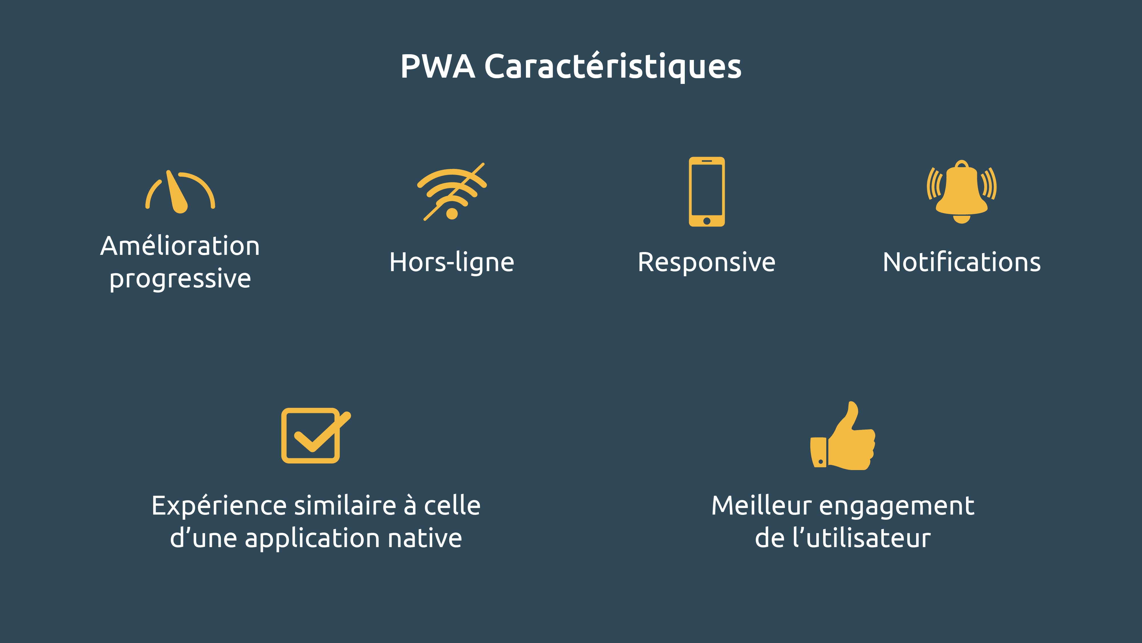 Une PWA ou Progressive Web App (applications web progressives en français) est un site Internet qui intègre les fonctionnalités normalement réservées aux applications. Elle fonctionne comme un site web classique, c’est-à-dire : hébergement sur Internet, adresse URL, … mais possède aussi des fonctionnalités similaires à une application native (points que nous verrons plus bas).