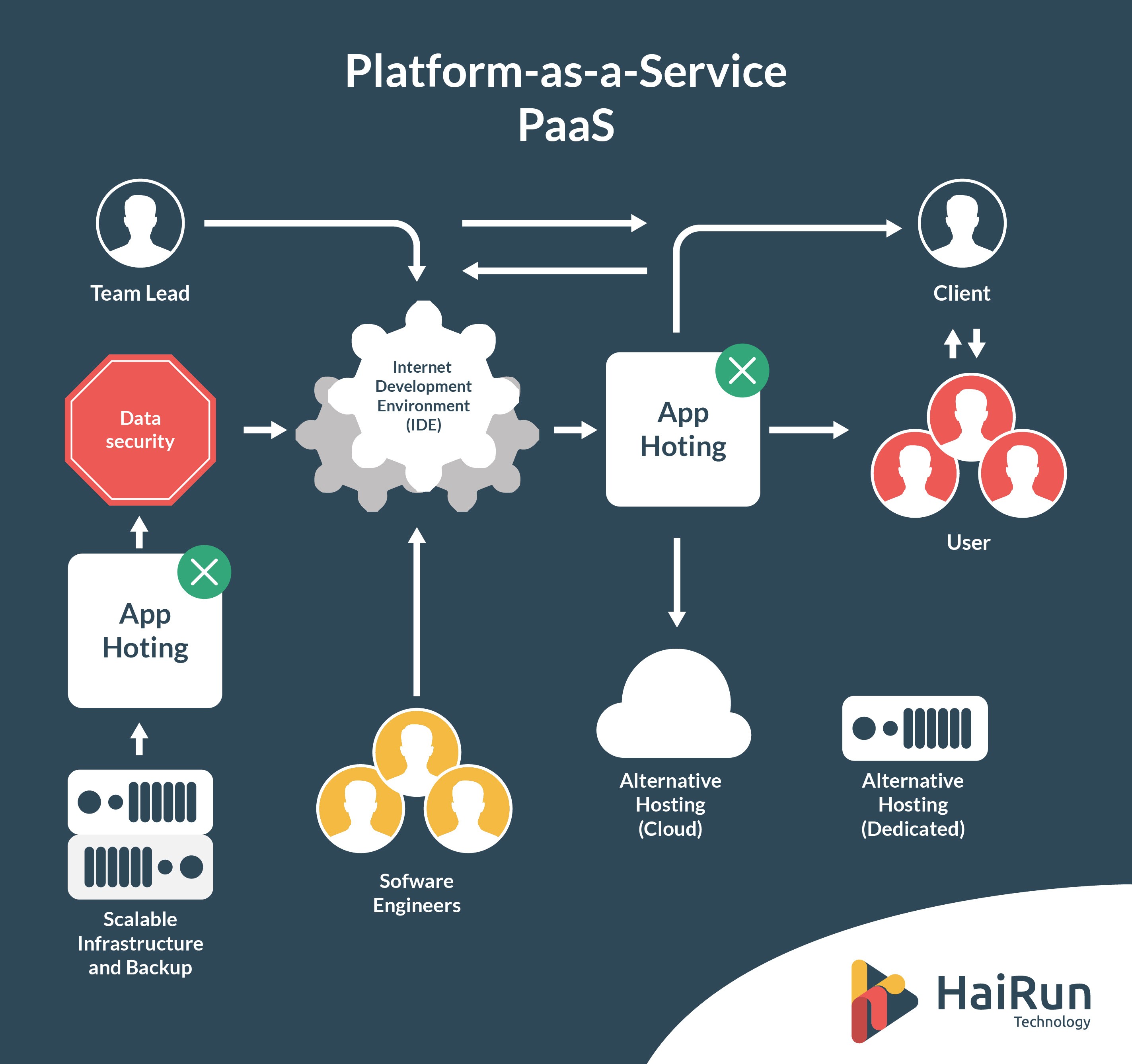 PaaS fournit des ensembles de services et de workflows, qui ciblent spécifiquement les développeurs, qui peuvent utiliser des outils, des processus et des API partagés, pour accélérer le développement, les tests et le déploiement d’applications. Heroku et Force.com de Salesforce sont des offres populaires de PaaS dans le cloud public ; Cloud Foundry de Pivotal et OpenShift de Red Hat peuvent être déployés sur site ou accessibles via les principaux clouds publics. Pour les entreprises, le PaaS peut garantir que les développeurs ont facilement accès aux ressources, suivent certains processus et n’utilisent qu’un ensemble spécifique de services, tandis que les opérateurs gèrent l’infrastructure sous-jacente.